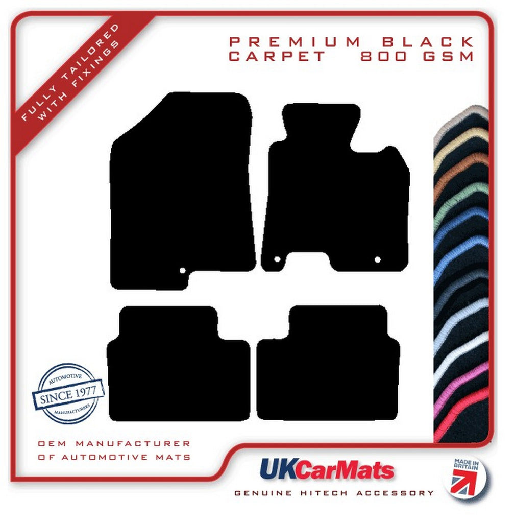 Previous NextHITECH’S NEWLY ADDED PREMIUM CARPET RANGE: A LUXURIOUS VERY HARD WEARING 800 gsm POLYAMIDE CARPET Please check if these are the correct mats for your car when your cars model year falls on the start or the end of the specified year range. If you are unsure please contact us before placing your order. Full set, front and rear mats. A set of fully tailored, premium tufted carpet mats for the above vehicle, manufactured to fit the shape of your car exactly, as per picture shown. The mats are manufactured from a high quality automotive tufted velour carpet, which has an 800 gsm pile weight and a total weight of 2400gsm. These mats have a cut-pile, are finished with an overlocked edge (also known as serging or whipped edging), and have an anti-slip, crumb tec backing. The mats will either be supplied with the original fixing system where applicable if the listing picture shows location holes or otherwise with an industry standard fixing kit for the driver mat. The fixing image, see third picture, confirms which fixing type will be supplied, if you are unsure these are correct for your car please ask! Please note: for OE style only the fixing rings will be supplied in the mats not the securing points as these should already be in the car. The black tufted carpet is available with a matching black edging or a contrasting coloured edging. There is a choice of 13 different edging colours: Apple Green, Autumn Brown, Black, Charcoal Grey, Hot Pink, Lemon Yellow, Light Grey, Light Steel Blue, Midnight Blue, Mushroom Cream, Polar White, Royal Blue and Racing Red. The carpet is also available in grey and beige and in our standard and luxury range, please check our other listings. Any questions, please let us know.
