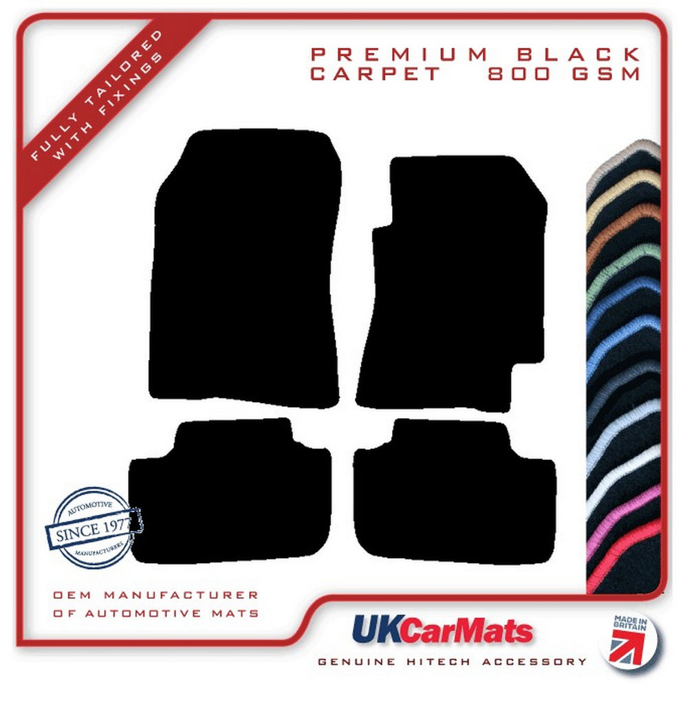 Previous NextHITECH’S NEWLY ADDED PREMIUM CARPET RANGE: A LUXURIOUS VERY HARD WEARING 800 gsm POLYAMIDE CARPET Please check if these are the correct mats for your car when your cars model year falls on the start or the end of the specified year range. If you are unsure please contact us before placing your order. Full set, front and rear mats. A set of fully tailored, premium tufted carpet mats for the above vehicle, manufactured to fit the shape of your car exactly, as per picture shown. The mats are manufactured from a high quality automotive tufted velour carpet, which has an 800 gsm pile weight and a total weight of 2400gsm. These mats have a cut-pile, are finished with an overlocked edge (also known as serging or whipped edging), and have an anti-slip, crumb tec backing. The mats will either be supplied with the original fixing system where applicable if the listing picture shows location holes or otherwise with an industry standard fixing kit for the driver mat. The fixing image, see third picture, confirms which fixing type will be supplied, if you are unsure these are correct for your car please ask! Please note: for OE style only the fixing rings will be supplied in the mats not the securing points as these should already be in the car. The black tufted carpet is available with a matching black edging or a contrasting coloured edging. There is a choice of 13 different edging colours: Apple Green, Autumn Brown, Black, Charcoal Grey, Hot Pink, Lemon Yellow, Light Grey, Light Steel Blue, Midnight Blue, Mushroom Cream, Polar White, Royal Blue and Racing Red. The carpet is also available in grey and beige and in our standard and luxury range, please check our other listings. Any questions, please let us know.