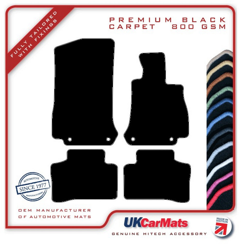 Previous NextHITECH’S NEWLY ADDED PREMIUM CARPET RANGE: A LUXURIOUS VERY HARD WEARING 800 gsm POLYAMIDE CARPET Please check if these are the correct mats for your car when your cars model year falls on the start or the end of the specified year range. If you are unsure please contact us before placing your order. Full set, front and rear mats. A set of fully tailored, premium tufted carpet mats for the above vehicle, manufactured to fit the shape of your car exactly, as per picture shown. The mats are manufactured from a high quality automotive tufted velour carpet, which has an 800 gsm pile weight and a total weight of 2400gsm. These mats have a cut-pile, are finished with an overlocked edge (also known as serging or whipped edging), and have an anti-slip, crumb tec backing. The mats will either be supplied with the original fixing system where applicable if the listing picture shows location holes or otherwise with an industry standard fixing kit for the driver mat. The fixing image, see third picture, confirms which fixing type will be supplied, if you are unsure these are correct for your car please ask! Please note: for OE style only the fixing rings will be supplied in the mats not the securing points as these should already be in the car. The black tufted carpet is available with a matching black edging or a contrasting coloured edging. There is a choice of 13 different edging colours: Apple Green, Autumn Brown, Black, Charcoal Grey, Hot Pink, Lemon Yellow, Light Grey, Light Steel Blue, Midnight Blue, Mushroom Cream, Polar White, Royal Blue and Racing Red. The carpet is also available in grey and beige and in our standard and luxury range, please check our other listings. Any questions, please let us know.