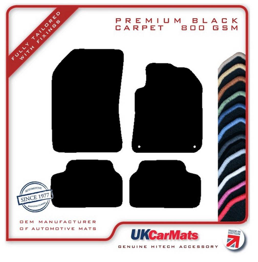 Previous NextHITECH’S NEWLY ADDED PREMIUM CARPET RANGE: A LUXURIOUS VERY HARD WEARING 800 gsm POLYAMIDE CARPET Please check if these are the correct mats for your car when your cars model year falls on the start or the end of the specified year range. If you are unsure please contact us before placing your order. Full set, front and rear mats. A set of fully tailored, premium tufted carpet mats for the above vehicle, manufactured to fit the shape of your car exactly, as per picture shown. The mats are manufactured from a high quality automotive tufted velour carpet, which has an 800 gsm pile weight and a total weight of 2400gsm. These mats have a cut-pile, are finished with an overlocked edge (also known as serging or whipped edging), and have an anti-slip, crumb tec backing. The mats will either be supplied with the original fixing system where applicable if the listing picture shows location holes or otherwise with an industry standard fixing kit for the driver mat. The fixing image, see third picture, confirms which fixing type will be supplied, if you are unsure these are correct for your car please ask! Please note: for OE style only the fixing rings will be supplied in the mats not the securing points as these should already be in the car. The black tufted carpet is available with a matching black edging or a contrasting coloured edging. There is a choice of 13 different edging colours: Apple Green, Autumn Brown, Black, Charcoal Grey, Hot Pink, Lemon Yellow, Light Grey, Light Steel Blue, Midnight Blue, Mushroom Cream, Polar White, Royal Blue and Racing Red. The carpet is also available in grey and beige and in our standard and luxury range, please check our other listings. Any questions, please let us know.