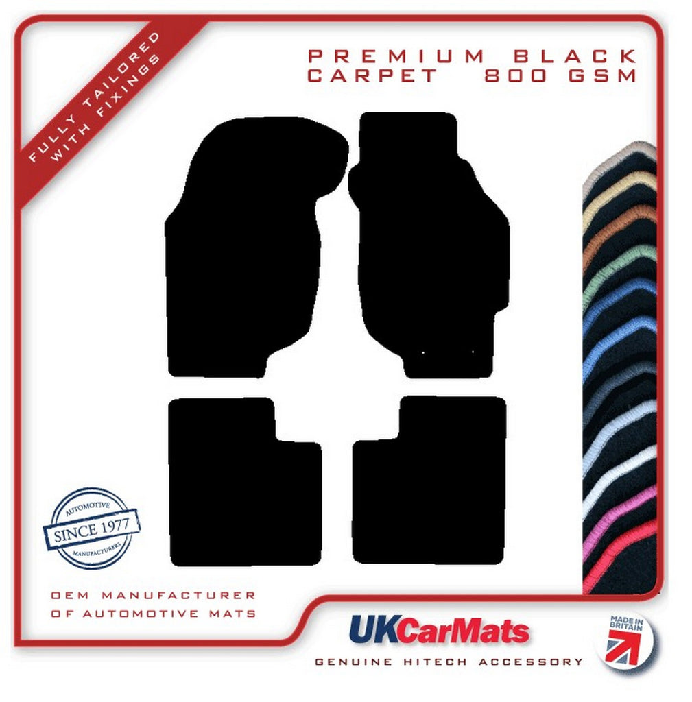 Previous NextHITECH’S NEWLY ADDED PREMIUM CARPET RANGE: A LUXURIOUS VERY HARD WEARING 800 gsm POLYAMIDE CARPET Please check if these are the correct mats for your car when your cars model year falls on the start or the end of the specified year range. If you are unsure please contact us before placing your order. Full set, front and rear mats. A set of fully tailored, premium tufted carpet mats for the above vehicle, manufactured to fit the shape of your car exactly, as per picture shown. The mats are manufactured from a high quality automotive tufted velour carpet, which has an 800 gsm pile weight and a total weight of 2400gsm. These mats have a cut-pile, are finished with an overlocked edge (also known as serging or whipped edging), and have an anti-slip, crumb tec backing. The mats will either be supplied with the original fixing system where applicable if the listing picture shows location holes or otherwise with an industry standard fixing kit for the driver mat. The fixing image, see third picture, confirms which fixing type will be supplied, if you are unsure these are correct for your car please ask! Please note: for OE style only the fixing rings will be supplied in the mats not the securing points as these should already be in the car. The black tufted carpet is available with a matching black edging or a contrasting coloured edging. There is a choice of 13 different edging colours: Apple Green, Autumn Brown, Black, Charcoal Grey, Hot Pink, Lemon Yellow, Light Grey, Light Steel Blue, Midnight Blue, Mushroom Cream, Polar White, Royal Blue and Racing Red. The carpet is also available in grey and beige and in our standard and luxury range, please check our other listings. Any questions, please let us know.