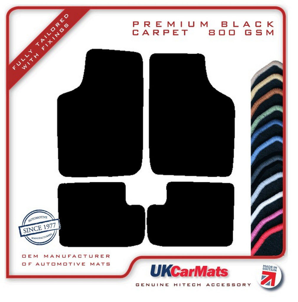 Previous NextHITECH’S NEWLY ADDED PREMIUM CARPET RANGE: A LUXURIOUS VERY HARD WEARING 800 gsm POLYAMIDE CARPET Please check if these are the correct mats for your car when your cars model year falls on the start or the end of the specified year range. If you are unsure please contact us before placing your order. Full set, front and rear mats. A set of fully tailored, premium tufted carpet mats for the above vehicle, manufactured to fit the shape of your car exactly, as per picture shown. The mats are manufactured from a high quality automotive tufted velour carpet, which has an 800 gsm pile weight and a total weight of 2400gsm. These mats have a cut-pile, are finished with an overlocked edge (also known as serging or whipped edging), and have an anti-slip, crumb tec backing. The mats will either be supplied with the original fixing system where applicable if the listing picture shows location holes or otherwise with an industry standard fixing kit for the driver mat. The fixing image, see third picture, confirms which fixing type will be supplied, if you are unsure these are correct for your car please ask! Please note: for OE style only the fixing rings will be supplied in the mats not the securing points as these should already be in the car. The black tufted carpet is available with a matching black edging or a contrasting coloured edging. There is a choice of 13 different edging colours: Apple Green, Autumn Brown, Black, Charcoal Grey, Hot Pink, Lemon Yellow, Light Grey, Light Steel Blue, Midnight Blue, Mushroom Cream, Polar White, Royal Blue and Racing Red. The carpet is also available in grey and beige and in our standard and luxury range, please check our other listings. Any questions, please let us know.