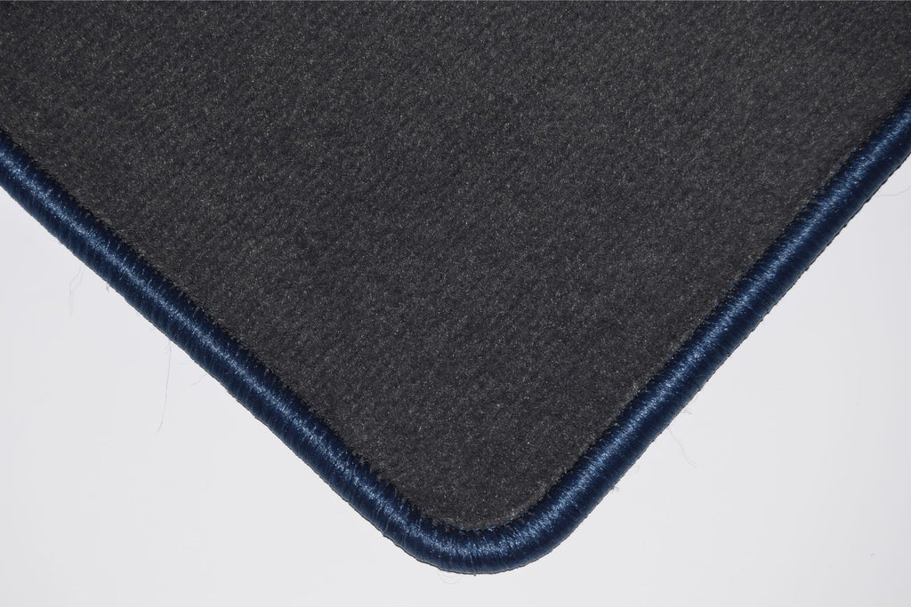 The mats are manufactured from a high quality grey automotive tufted velour carpet, which has a 750 gsm pile weight and a total weight of 2250gsm. These mats are finished with an overlocked edge (also known as serging or whipped edging), and have an anti-slip, granular backing.