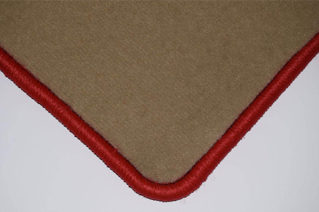 The mats are manufactured from a high quality beige automotive tufted velour carpet, which has a 750 gsm pile weight and a total weight of 2250gsm. These mats are finished with an overlocked edge (also known as serging or whipped edging), and have an anti-slip, granular backing.