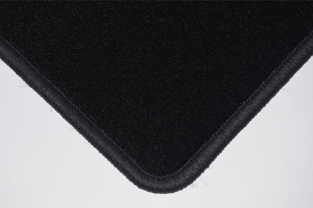 The mats are manufactured from a 650gsm pile weight automotive needle punch black carpet, with a total weight of 2000gsm. These mats are finished with an overlocked edge (also known as serging or whipped edging), and have an anti-slip, granular backing. A high frequency welded heel pad, see second picture, is added to the drivers mat to enhance comfort and extend the life of the product.