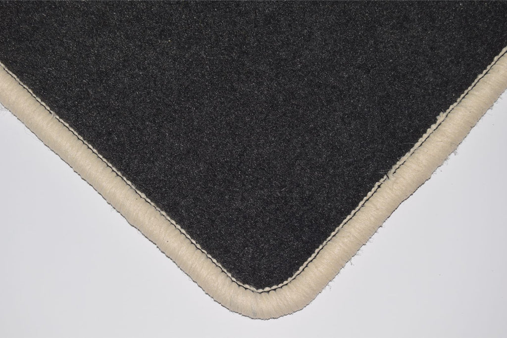 The mats are manufactured from a 650gsm pile weight automotive needle punch grey carpet, with a total weight of 2000gsm. These mats are finished with an overlocked edge (also known as serging or whipped edging), and have an anti-slip, granular backing. A high frequency welded heel pad in black colour, see second picture, is added to the drivers mat to enhance comfort and extend the life of the product.