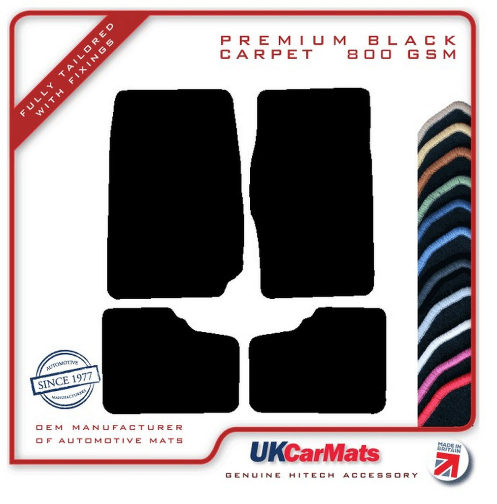 Previous NextHITECH’S NEWLY ADDED PREMIUM CARPET RANGE: A LUXURIOUS VERY HARD WEARING 800 gsm POLYAMIDE CARPET Please check if these are the correct mats for your car when your cars model year falls on the start or the end of the specified year range. If you are unsure please contact us before placing your order. Full set, front and rear mats. A set of fully tailored, premium tufted carpet mats for the above vehicle, manufactured to fit the shape of your car exactly, as per picture shown. The mats are manufactured from a high quality automotive tufted velour carpet, which has an 800 gsm pile weight and a total weight of 2400gsm. These mats have a cut-pile, are finished with an overlocked edge (also known as serging or whipped edging), and have an anti-slip, crumb tec backing. The mats will either be supplied with the original fixing system where applicable if the listing picture shows location holes or otherwise with an industry standard fixing kit for the driver mat. The fixing image, see third picture, confirms which fixing type will be supplied, if you are unsure these are correct for your car please ask! Please note: for OE style only the fixing rings will be supplied in the mats not the securing points as these should already be in the car. The black tufted carpet is available with a matching black edging or a contrasting coloured edging. There is a choice of 13 different edging colours: Apple Green, Autumn Brown, Black, Charcoal Grey, Hot Pink, Lemon Yellow, Light Grey, Light Steel Blue, Midnight Blue, Mushroom Cream, Polar White, Royal Blue and Racing Red. The carpet is also available in grey and beige and in our standard and luxury range, please check our other listings. Any questions, please let us know.