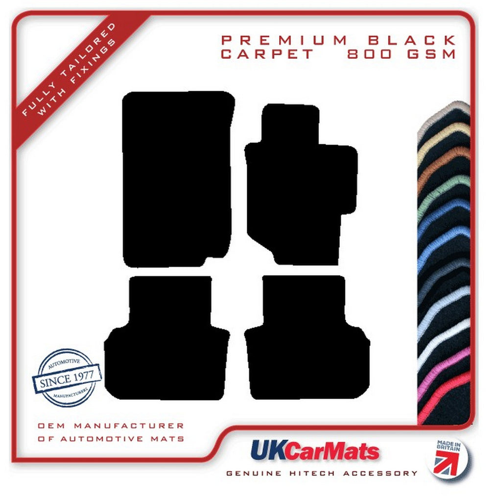 Previous NextHITECH’S NEWLY ADDED PREMIUM CARPET RANGE: A LUXURIOUS VERY HARD WEARING 800 gsm POLYAMIDE CARPET Please check if these are the correct mats for your car when your cars model year falls on the start or the end of the specified year range. If you are unsure please contact us before placing your order. Full set, front and rear mats. A set of fully tailored, premium tufted carpet mats for the above vehicle, manufactured to fit the shape of your car exactly, as per picture shown. The mats are manufactured from a high quality automotive tufted velour carpet, which has an 800 gsm pile weight and a total weight of 2400gsm. These mats have a cut-pile, are finished with an overlocked edge (also known as serging or whipped edging), and have an anti-slip, crumb tec backing. The mats will either be supplied with the original fixing system where applicable if the listing picture shows location holes or otherwise with an industry standard fixing kit for the driver mat. The fixing image, see third picture, confirms which fixing type will be supplied, if you are unsure these are correct for your car please ask! Please note: for OE style only the fixing rings will be supplied in the mats not the securing points as these should already be in the car. The black tufted carpet is available with a matching black edging or a contrasting coloured edging. There is a choice of 13 different edging colours: Apple Green, Autumn Brown, Black, Charcoal Grey, Hot Pink, Lemon Yellow, Light Grey, Light Steel Blue, Midnight Blue, Mushroom Cream, Polar White, Royal Blue and Racing Red. The carpet is also available in grey and beige and in our standard and luxury range, please check our other listings. Any questions, please let us know.