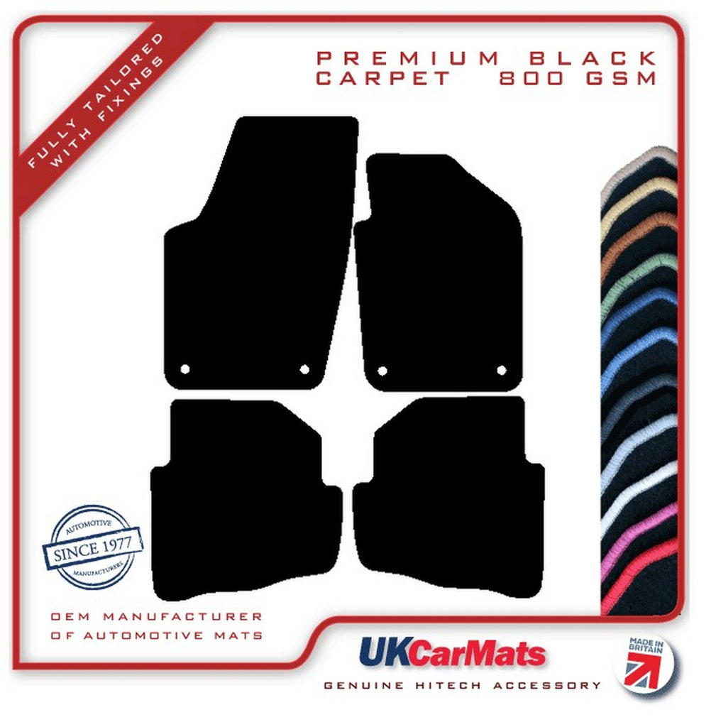 Previous NextHITECH’S NEWLY ADDED PREMIUM CARPET RANGE: A LUXURIOUS VERY HARD WEARING 800 gsm POLYAMIDE CARPET Please check if these are the correct mats for your car when your cars model year falls on the start or the end of the specified year range. If you are unsure please contact us before placing your order. Full set, front and rear mats. A set of fully tailored, premium tufted carpet mats for the above vehicle, manufactured to fit the shape of your car exactly, as per picture shown. The mats are manufactured from a high quality automotive tufted velour carpet, which has an 800 gsm pile weight and a total weight of 2400gsm. These mats have a cut-pile, are finished with an overlocked edge (also known as serging or whipped edging), and have an anti-slip, crumb tec backing. The mats will either be supplied with the original fixing system where applicable if the listing picture shows location holes or otherwise with an industry standard fixing kit for the driver mat. The fixing image, see third picture, confirms which fixing type will be supplied, if you are unsure these are correct for your car please ask! Please note: for OE style only the fixing rings will be supplied in the mats not the securing points as these should already be in the car. The black tufted carpet is available with a matching black edging or a contrasting coloured edging. There is a choice of 13 different edging colours: Apple Green, Autumn Brown, Black, Charcoal Grey, Hot Pink, Lemon Yellow, Light Grey, Light Steel Blue, Midnight Blue, Mushroom Cream, Polar White, Royal Blue and Racing Red. The carpet is also available in grey and beige and in our standard and luxury range, please check our other listings. Any questions, please let us know.