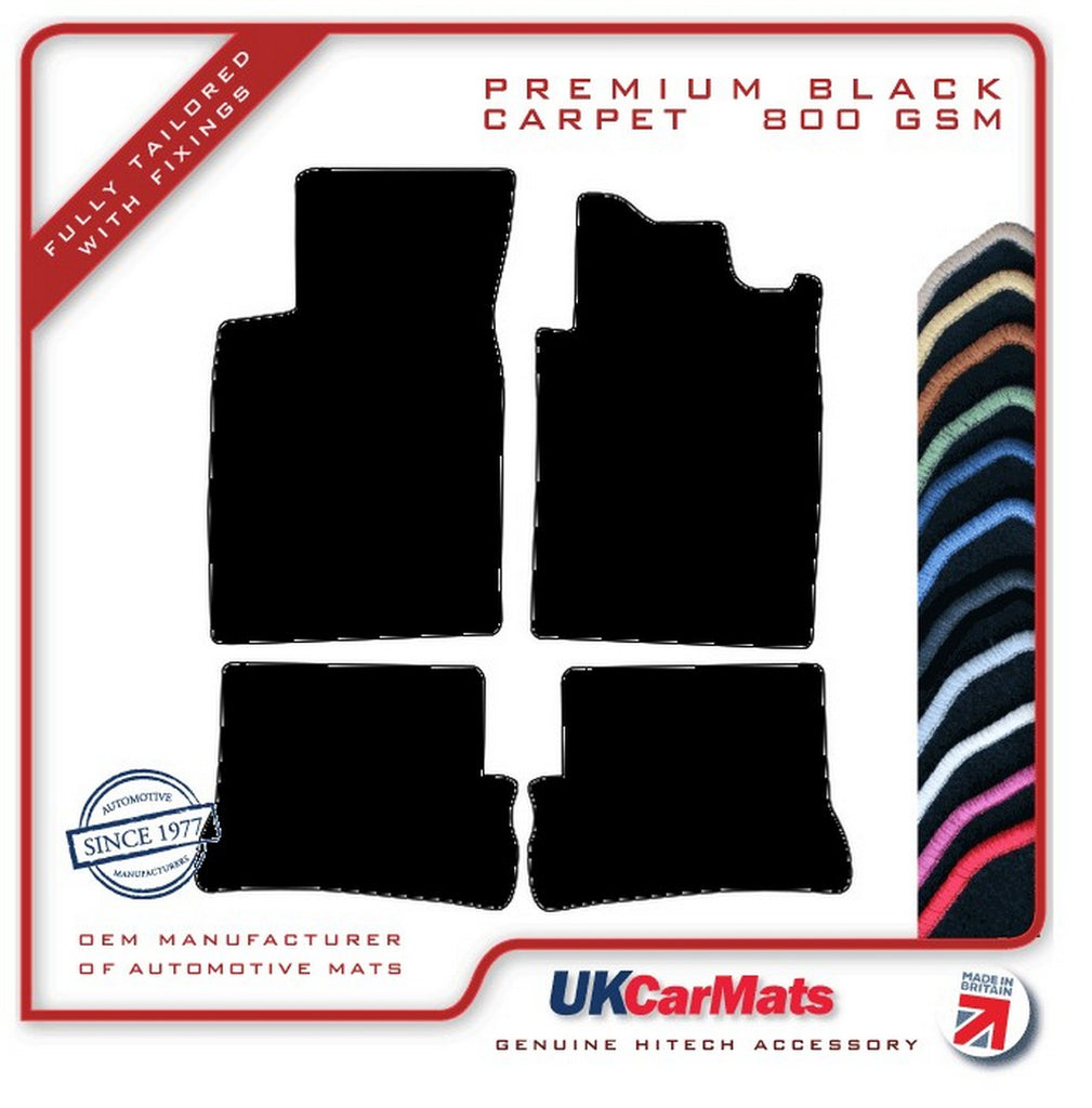 Previous NextHITECH’S NEWLY ADDED PREMIUM CARPET RANGE: A LUXURIOUS VERY HARD WEARING 800 gsm POLYAMIDE CARPET Please check if these are the correct mats for your car when your cars model year falls on the start or the end of the specified year range. If you are unsure please contact us before placing your order. Full set, front and rear mats. A set of fully tailored, premium tufted carpet mats for the above vehicle, manufactured to fit the shape of your car exactly, as per picture shown. The mats are manufactured from a high quality automotive tufted velour carpet, which has an 800 gsm pile weight and a total weight of 2400gsm. These mats have a cut-pile, are finished with an overlocked edge (also known as serging or whipped edging), and have an anti-slip, crumb tec backing. The mats will either be supplied with the original fixing system where applicable if the listing picture shows location holes or otherwise with an industry standard fixing kit for the driver mat. The fixing image, see third picture, confirms which fixing type will be supplied, if you are unsure these are correct for your car please ask! Please note: for OE style only the fixing rings will be supplied in the mats not the securing points as these should already be in the car. The black tufted carpet is available with a matching black edging or a contrasting coloured edging. There is a choice of 13 different edging colours: Apple Green, Autumn Brown, Black, Charcoal Grey, Hot Pink, Lemon Yellow, Light Grey, Light Steel Blue, Midnight Blue, Mushroom Cream, Polar White, Royal Blue and Racing Red. The carpet is also available in grey and beige and in our standard and luxury range, please check our other listings. Any questions, please let us know.
