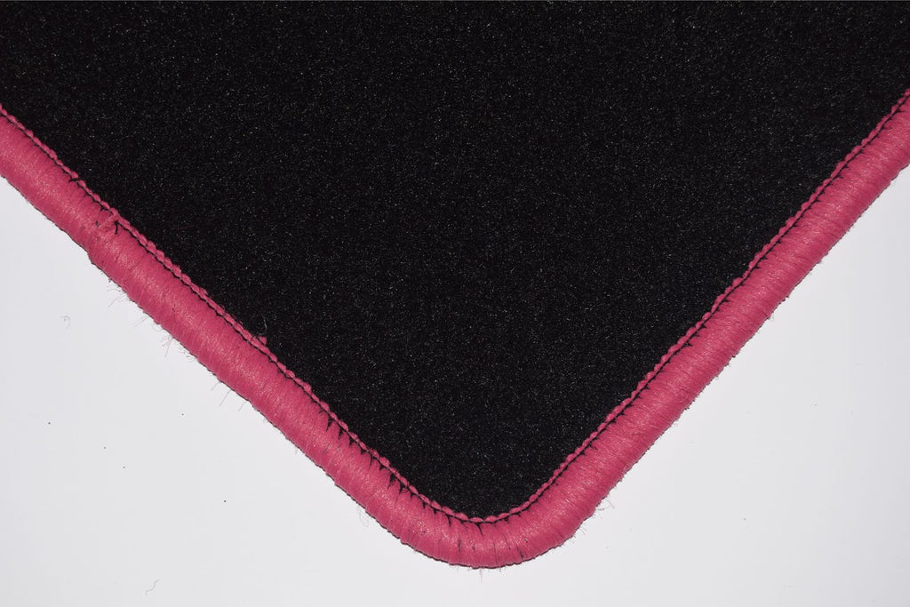 The mats are manufactured from a 650gsm pile weight automotive needle punch black carpet, with a total weight of 2000gsm. These mats are finished with an overlocked edge (also known as serging or whipped edging), and have an anti-slip, granular backing. A high frequency welded heel pad, see second picture, is added to the drivers mat to enhance comfort and extend the life of the product.